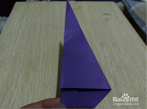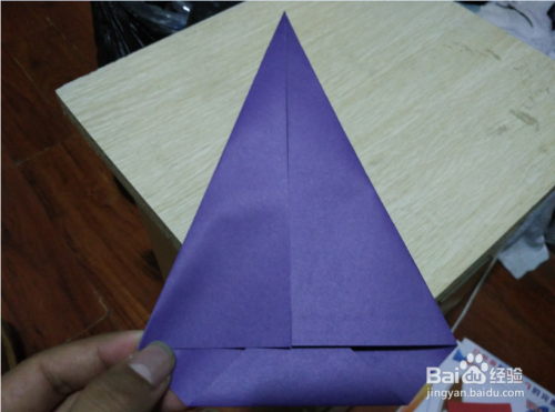 然后将步骤4中的尖角大约二分之一处向里面折叠,折叠的边与底边接近平行