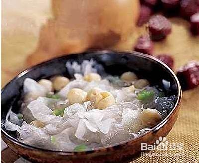 材料:白木耳60克,糯米100克。白木耳先用清水发泡洗净。糯米淘净后,置入锅内加水烧开,再放入银耳,熬煮成粥,调入一些冰糖即成。此粥滋阴生津、润肺养胃、益气和血,可治虚劳咳嗽、痰中带血、阴虚口渴。