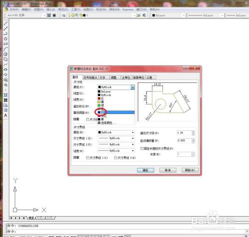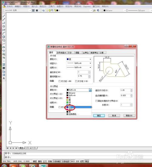 单击【尺寸界线】区域中的【颜色】下拉按钮,选择【蓝】选项,如下图所示