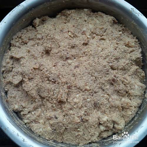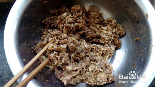 肉馅放入酱油、适量盐、花椒朝一个方向拌好待用。