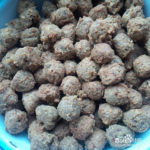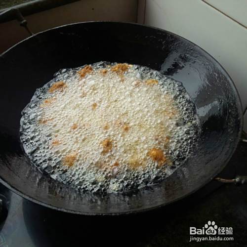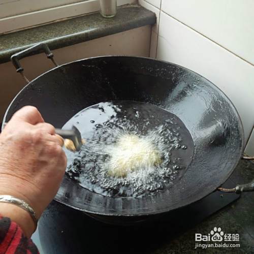 干锅入油,七成热时,用左手的虎口处挤出丸子,右手用勺子舀起,放入油锅。