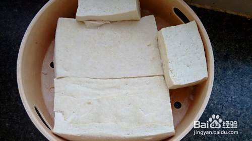 2块豆腐稍稍蒸一会儿,去掉水分。(用了2块)