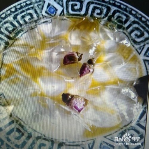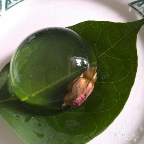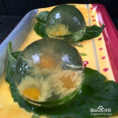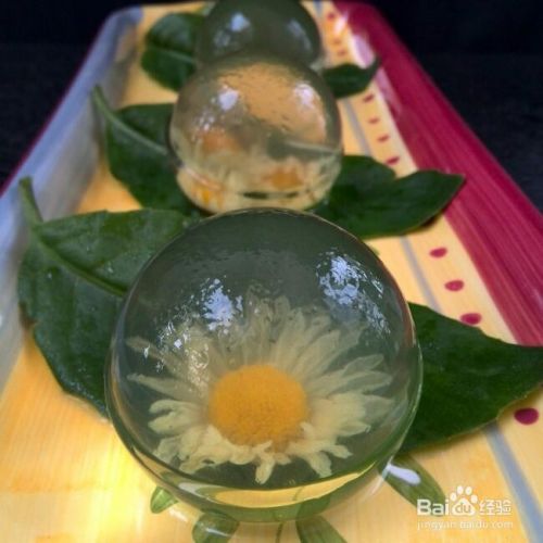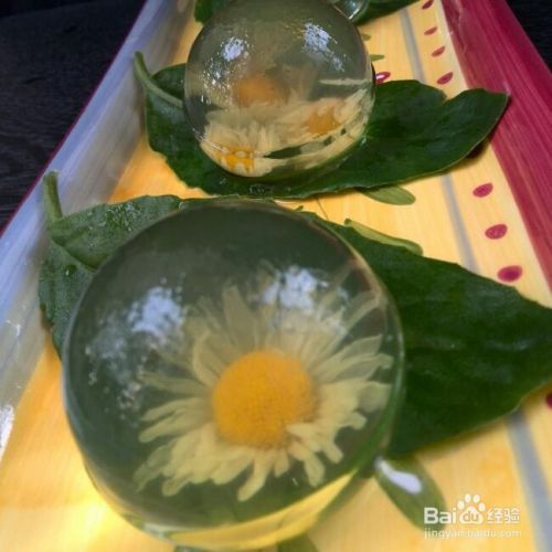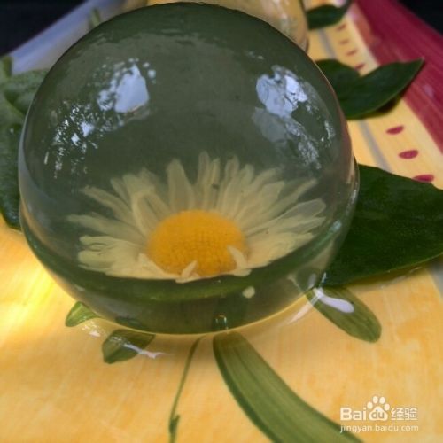 5取出球模,打开顶盖,将菊花放入泡泡中,将冻好的果冻贴在花前