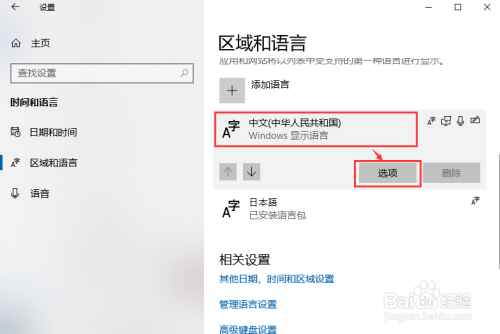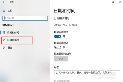 进入时间和语言选项后,在左侧区域点击区域和语言