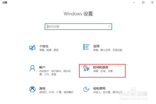 弹出设置窗口,向下拖动滚动条,找到时间和语言,点击时间和语言。时间和语言中可以设置输入法。