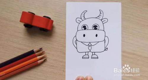 接下来,画出牛的身体,尽量画得方形一点,短一点,这样才像笔挺的西服,注意要画出脖子上的领带