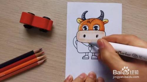 下面开始上色啦!用灰色涂牛角,橙色和黄色涂牛耳朵和牛头,脸部涂肤色