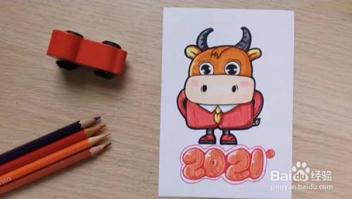 最后,用粉色涂腮红,红色涂衣服和鞋面,黄色涂领带和尾巴,灰色涂双腿和鞋底,再用红色画出“2021”以及小一点的“年”字,再用红色描一下边,这样一个2021年职场打工牛就画好了