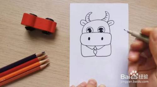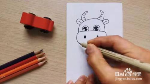 接着,画出牛角,注意要画出牛的纹路,下面画出牛耳朵,注意要划分内外侧,还要画出竖着的椭圆形的鼻子