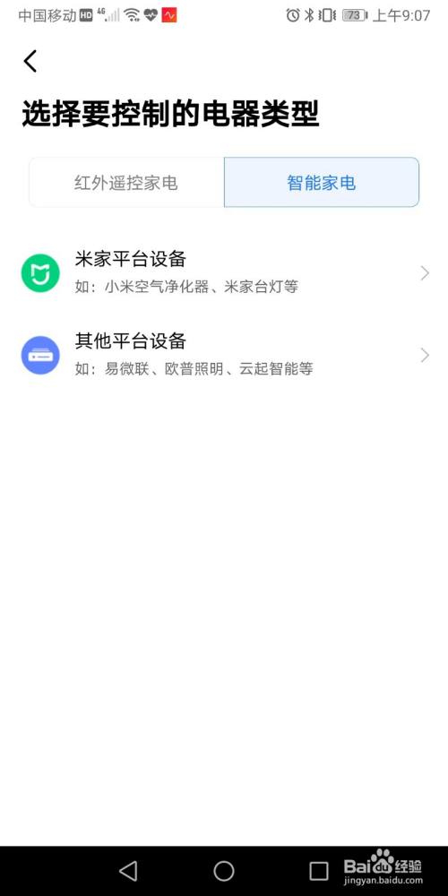 3. 此时我们可以看到能控制的电器类型:红外遥控家电和智能家电。红外遥控家电包括电视、机顶盒、空调等等;智能家电有米家平台设备和其他平台设备。此例子我们选择红外遥控家电。