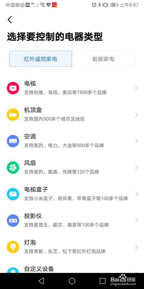 此时我们可以看到能控制的电器类型:红外遥控家电和智能家电。红外遥控家电包括电视、机顶盒、空调等等;智能家电有米家平台设备和其他平台设备。此例子我们选择红外遥控家电。