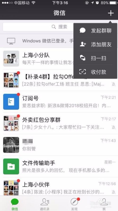 第一步:打开手机中的微信APP,点击界面右上角的“+”——“添加朋友”进入添加好友界面。