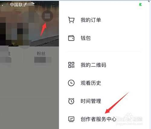 进入我的页面首先右上方打开三条杠然后点击创作者中心