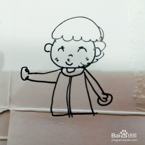 第四步,我们来画卡通男孩的两只胳膊和手。