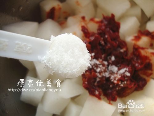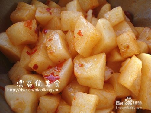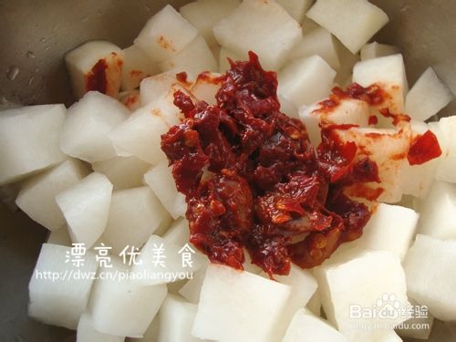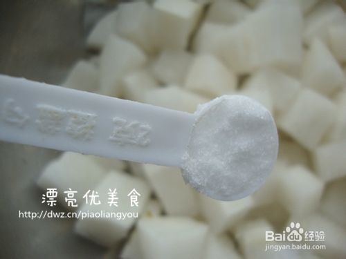 切成大小均匀的块,放咸盐把萝卜里的水分腌出来。