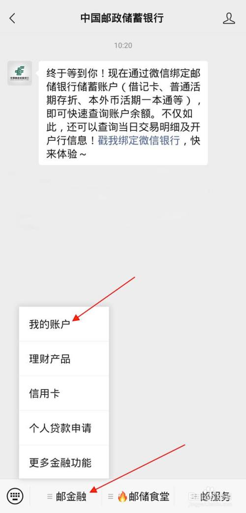 1、打开微信,搜索并关注进入【中国邮政储蓄银行】公众号,点击【邮金融】,点击【我的账户】。