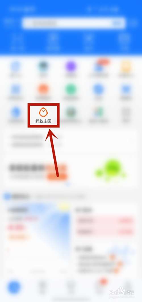 进入支付宝首页后,点击菜单中的蚂蚁庄园。