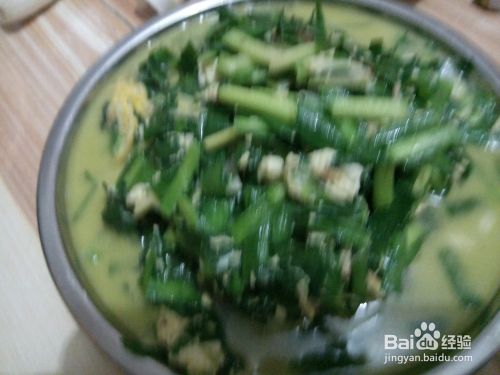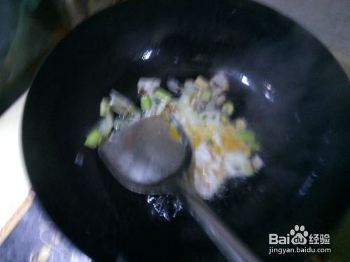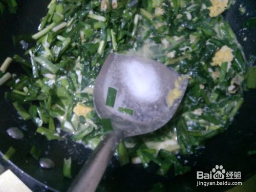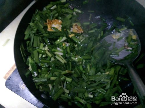 倒入之前切好的韭菜,进行小火翻炒。