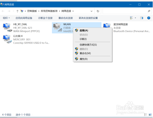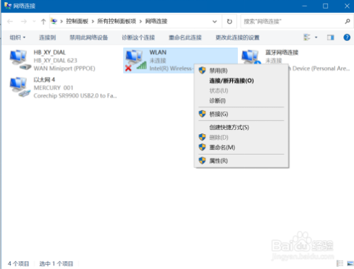 在打开的网络连接界面中,找到无线连接“WLAN”(如果电脑是通过网线上网的话,要找到“以太网”或“本地连接”,),右键单击选择“禁用”,然后会看到WLAN会变成灰色,说明已被成功禁用。