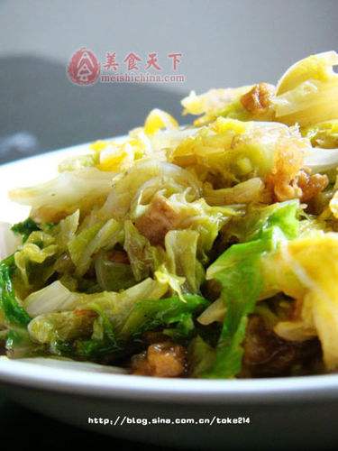 4、最后倒入莲白炒,可以适量加入一勺水,这是我炒素菜的一个习惯,免得把菜炒干了。另外如果喜欢有点颜色也可以放点生抽。