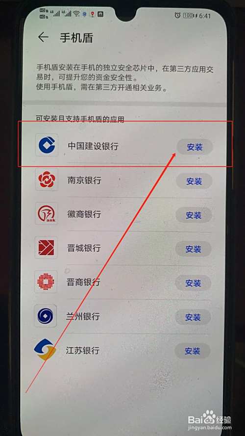 4.点开“手机盾”,在该界面找到“中国银行建设银行”,只需点击后边的“安装”按钮即可。