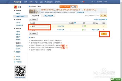 点击“产品自定义分类”下“添加分类”后,输入需要添加的“分类名称”,点击“保存”即可。如图2、3、4所示。