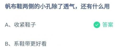 蚂蚁庄园有个问题是帆布鞋两侧的小孔除了透气,还有什么用?很多人都注意过帆布鞋两侧的小孔,但真不是很清楚小孔的作用是什么,下面就来了解一下: