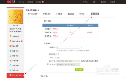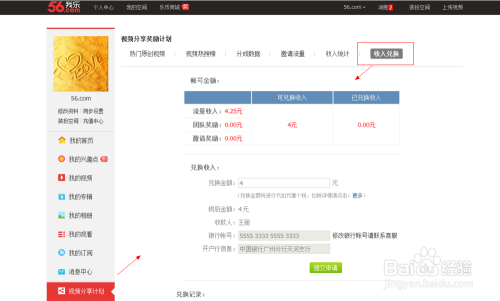 当视频收入达到100元或以上,就可以申请兑换视频收入,在“个人中心—>视频分享奖励计划—>收入兑换”栏目进行申请提现。但是首先要把你的银行卡信息绑定一下,否则无法给你打款。