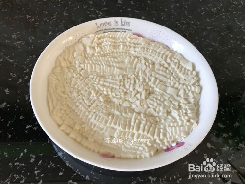 将3个鸡蛋打入一个空碗中,放入一点点盐搅拌成鸡蛋液,淋在盘子的豆腐丁上面,裹上一层保鲜膜。