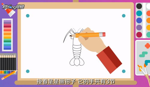 画上钳子,它的手共有三节,其次是画其余的脚,每边有三条。