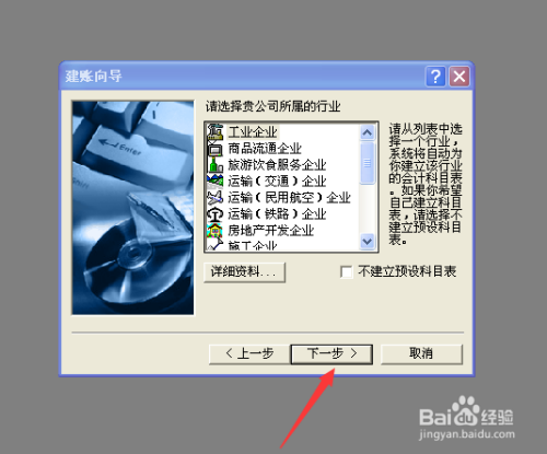 选择公司所属的行业,如果想自己建立科目表,那么就在那个不建立预设科目表上打勾。