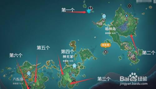 稻妻一共六个地灵龛,在地图上的位置如下;