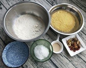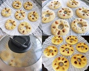 将生胚有距离的摆在铺有屉布的蒸锅中,表面粘上坚果(葡萄干蔓越莓……)进行2次发酵~