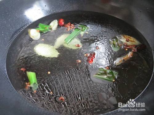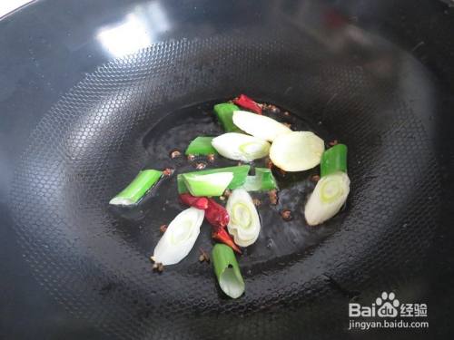 锅中倒入油烧热后加入葱姜、花椒和干辣椒爆香