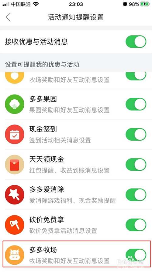 6.打开多多牧场的开关,这样以后多多牧场的奖励消息,好友的互动消息就都不会错过了