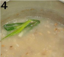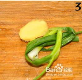 5.切一片姜,其实姜丝是最好的,可是小孩肯定不会喜欢姜的味道。把葱像图3一样捆个节,然后拿刀拍一拍,让葱汁挤出来,然后都丢进锅里。大火烧开后,用小火焖着,熬半个小时就可以了。