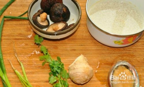 11.要用的吃的都准备好,小葱和香菜清洗干净。香菇我用的是干香菇,气味浓郁,泡发后发现给宝宝吃其实2朵就够了,不用这么多的。大米事先用水泡上半个小时左右,记得滴几滴香油。