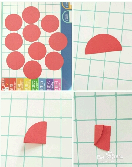在红色彩纸上画出20个圆,然后用剪刀把圆剪下来(圆太多了,所以拍照只拍了一部分);拿一个圆平衡对折,再往左边折,再如第四小格图片摆放,把弧形往右边折。