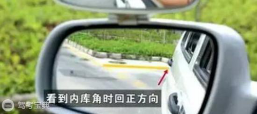 当从左侧后视镜里看到内库角的时候,就是车库里最里面的库角的时候,我们迅速回正方向盘同时通过左面后视镜观察左后轮。