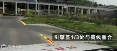 开始侧方停车时,一定先要将车正确倒入指定的开始位置上。我们先要将车驶入侧方位停车道路上,将车的引擎盖右侧三分之一的这个位置和右侧这条黄线重合(就是引擎盖右侧三分之一的这个位置正好覆盖在黄线上)。
