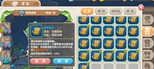 打开背包之后,点击【潦草笔记】,会弹出这个道具的说明,然后大家点击探索,就可以自动前往探索宝藏了。