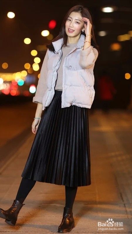 黑色百褶裙穿起来最百搭了,上面搭配一件浅灰色棉马甲非常显瘦