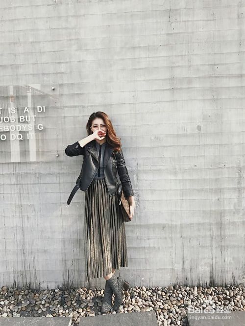 浅金色百褶裙穿起来特别亮,上面搭配一件黑色皮衣特别洋气,整体给人的感觉非常百搭