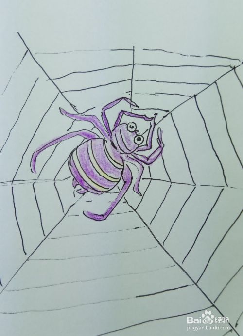 再用线条和曲线画出蜘蛛的身体部分,并画出蜘蛛身上的花纹,然后涂出蜘蛛的色彩。