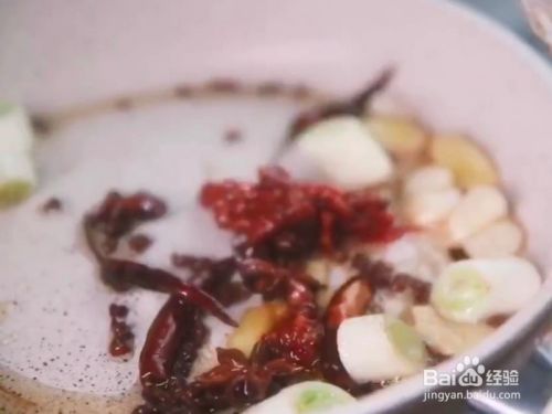 然后锅里烧油,放入八角、花椒、干辣椒,葱段、姜片、蒜瓣,爆香。