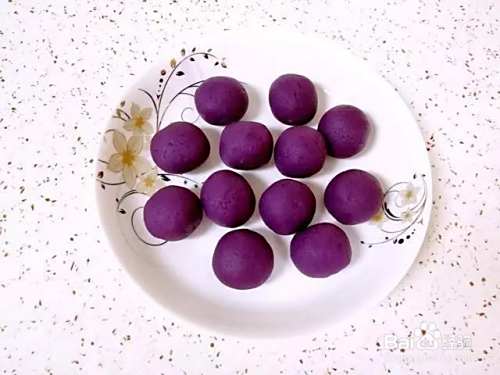8、 分好的紫薯馅包入咸蛋黄,搓圆密封。