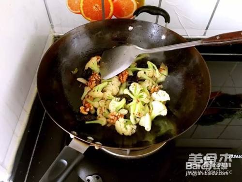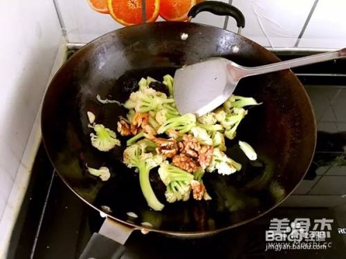 4看到菜花梗变绿,放入提前烤熟的核桃仁。