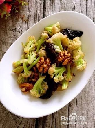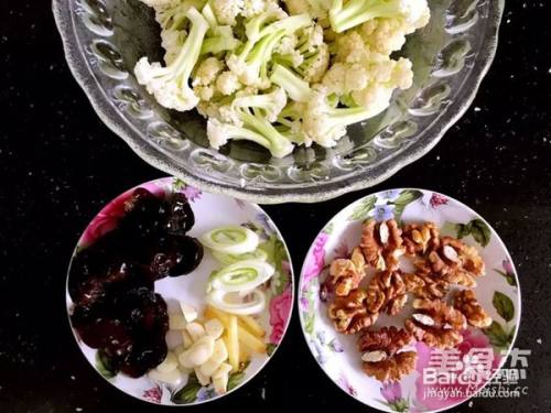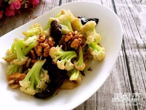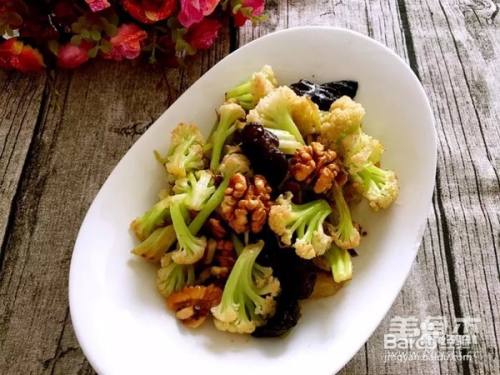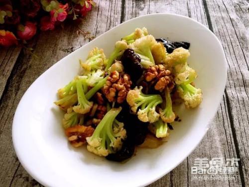 核桃仁,营养丰富,可滋补身体,医学认为它有强肾填精、补脑益智、延年益寿之功效。还含有丰富的氨基酸,特别是含有对人体健康有重要作用的赖氨酸(有增智作用)及维生E,微量元素锌、铬、锰等。核桃仁的营养价值,突出地表现在对大脑的滋补作用,有明显的健脑益智功效。 菜花是有机菜花,口感脆,两者结合,味道和营养都很赞。