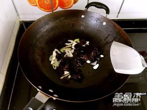 2锅中放油,油六成热时,放入葱花、姜丝、蒜片爆香,再放入木耳翻炒片刻。