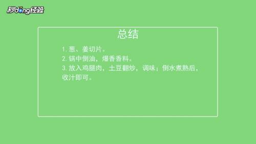 3入锅炒制,在锅中倒油,爆香葱姜,加入八角煸香,放入鸡腿肉、土豆翻炒,加生抽盐,粉,倒水煮熟后收汁即可。